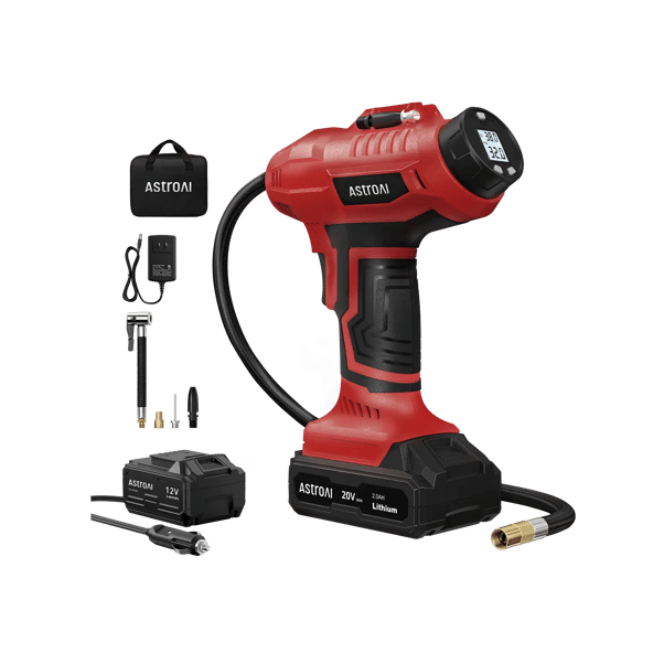 AstroAI 20V Rechargeable Battery Powered High-Speed Air Compressors with 12V Car Power Adapter for Cars, Red
