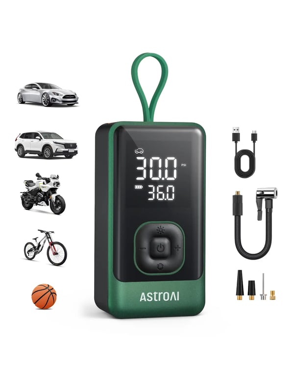 AstroAI L7 Air Tire Inflator Portable Air Compressor, 150PSI Electric Cordless Pump with Fast 1-min Inflation, Auto Shutoff, LED Light – Rechargeable for Car, SUV, Motorcycle, Bike Tires (Green)
