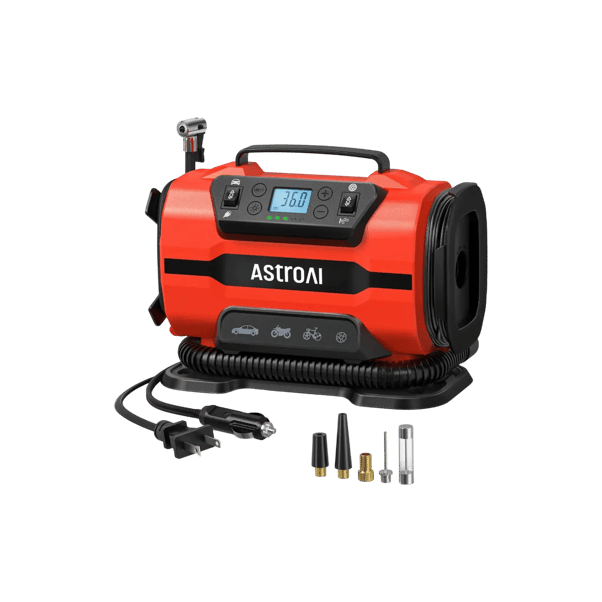 AstroAI Tire Inflator Portable Air Compressor Pump 150PSI 12V DC/110V AC with Dual Metal Motors &LED Light, Automotive Car Accessories&Two mode for car, bicycle tires and air mattresses, Red